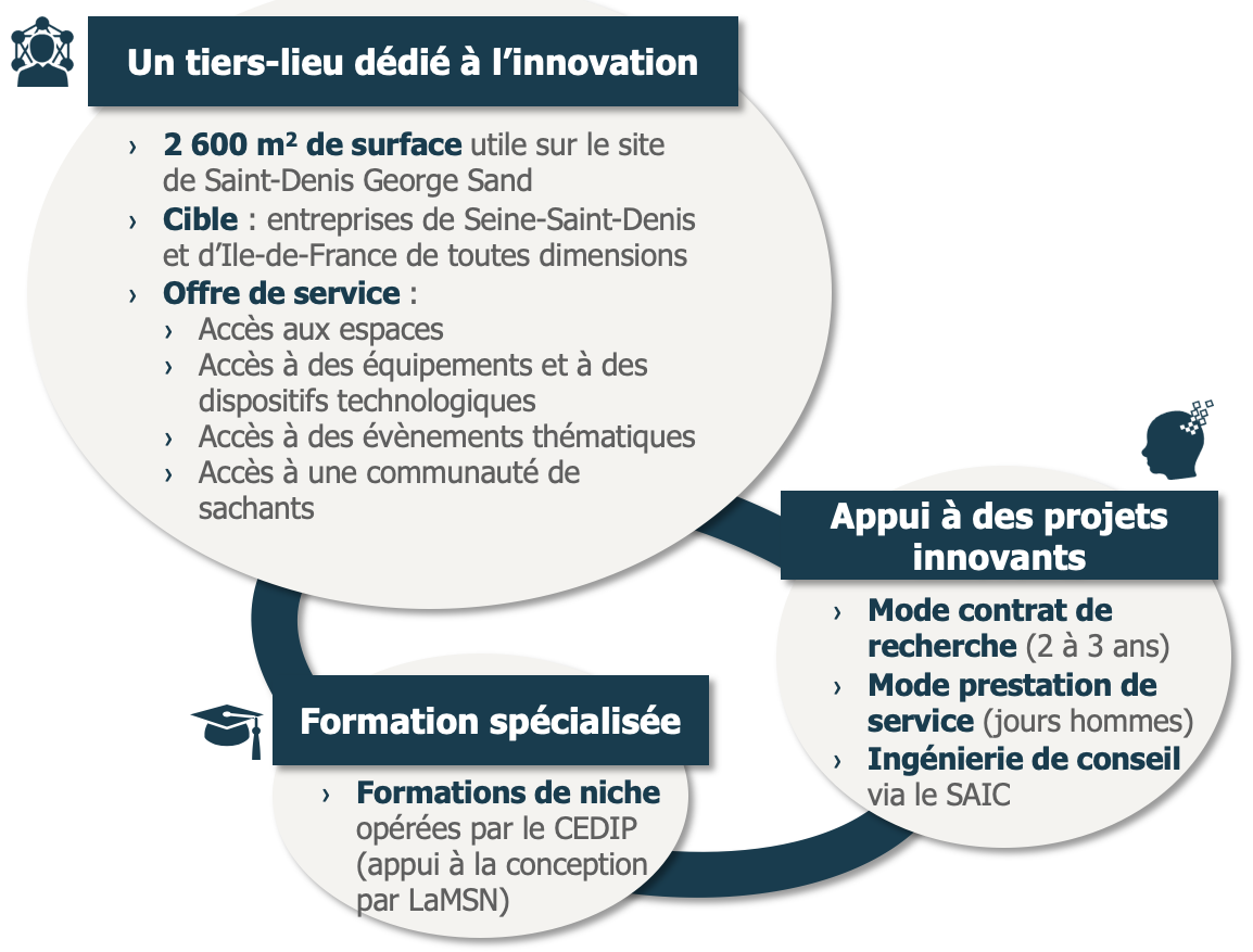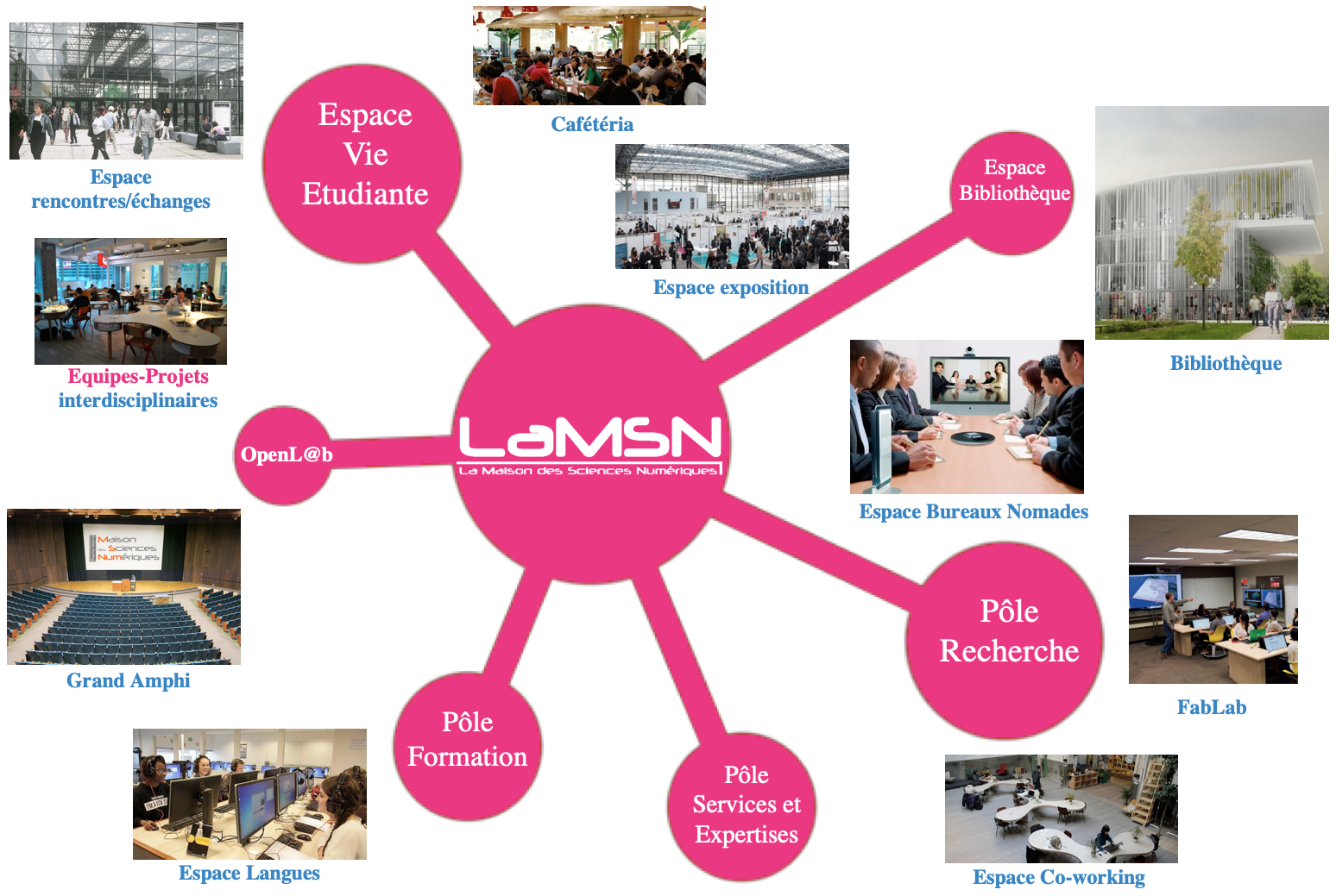 LaMSN est une structure qui apportera de nouveaux espaces de recherche, de formation et d’innovation et complétera les espaces déjà existants à l’université Sorbonne Paris Nord. C’est une organisation permettant de regrouper et de structurer sur un site scientifique des expertises pluridisciplinaires de grande ampleur autour du numérique. LaMSN est un tiers-lieu au cœur de l’université qui intègre un complexe événementiel, un lieu de valorisation de la re cherche partenariale, des espaces de pédagogie innovante (OPéNL@b : Outils Pédagogiques Numériques Lab), des bureaux nomades, et des espaces de co-working, constituant ainsi un modèle original de rencontres et d’innovation entre l’université, le monde socio-économique et la société civile. LaMSN est un lieu de travail flexible, agile et réactif aux interactions avec des sources externes d’idées, et ouvert à la mixité des carrières entre l’université et les entreprises. LaMSN est principalement destinée à venir en appui à la communauté scientifique académique et levier pour le monde socio-économique. Elle est ainsi complémentaire avec les autres structures de recherche et de formation existantes à l’université.