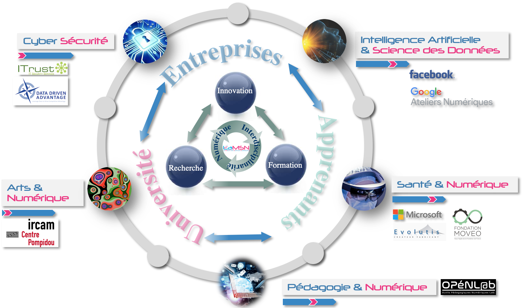 LaMSN est fondée sur trois piliers : recherche, formation, et innovation. L’articulation entre ces trois dimensions et l’approche interdisciplinaire déployée au sein de LaMSN est un facteur différenciant et innovant qui doit faciliter le passage des innovations de l’idée au marché. LaMSN a pour mission d’offrir un support exceptionnel pour renforcer : le continuum recherche – entreprises, le continuum recherche – société et le continuum recherche – formation. LaMSN a pour objectifs de développer une vision intégrative en recherche de pointe couplée à des formations d’excellences et de booster les relations entre le monde académique et industriel. L’intérêt est double : d’un côté, favoriser l’employabilité des étudiants, qui seront formés aux dernières technologies utilisées par l’industrie, et de l’autre, offrir un appui à l’entrepreneuriat local et à la recherche scientifique autour des sciences numériques.